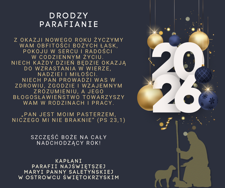 - We czwartek powitamy Nowy rok Pański 2026. Porządek nabożeństw jak w każdą niedzielę. Udziałem we Mszy św. i Bożym błogosławieństwem rozpocznijmy Nowy Rok. Serdecznie zapraszamy.