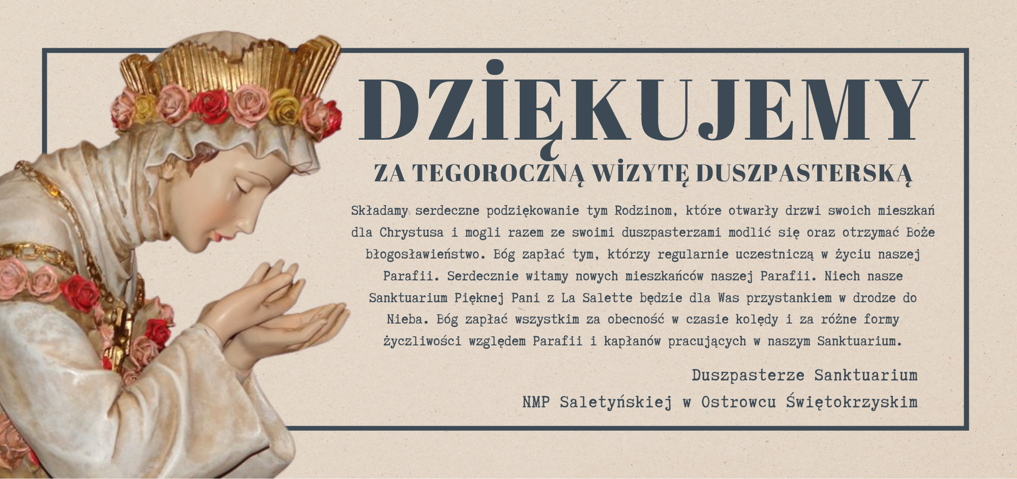 - Jutro kończymy wizytę duszpasterską. Podobnie jak w latach ubiegłych kapłana przyjęło połowę rodzin zamieszkałych naszą Parafię. Składamy serdeczne podziękowanie tym Rodzinom, które otwarły drzwi swoich mieszkań dla Chrystusa i mogli razem ze swoimi duszpasterzami modlić się oraz otrzymać Boże błogosławieństwo. Bóg zapłać tym, którzy regularnie uczestniczą w życiu naszej Parafii. Serdecznie witamy nowych mieszkańców naszej Parafii. Niech nasze Sanktuarium Pięknej Pani z La Salette będzie dla Was przystankiem w drodze do Nieba. Bóg zapłać wszystkim za obecność w czasie kolędy i za różne formy życzliwości względem Parafii i kapłanów pracujących w naszym Sanktuarium. Bóg zapłać za złożone ofiary, które pomogą kontynuować prace przy naszym kościele na Piaskach. Dziękujemy za dobre sugestie związane z funkcjonowaniem naszej Wspólnoty Parafialnej. Dziękujemy ministrantom za pomoc w kolędowaniu.